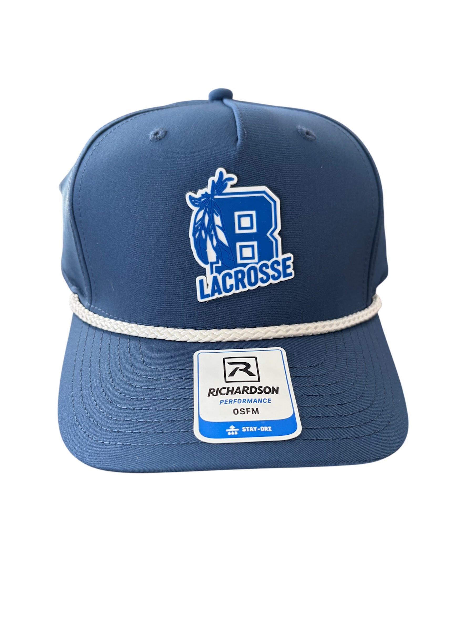 Richardson brand, 258 performance 5-panel snapback rope hat in a medium blue color, featuring the "B" lacrosse rubber letter logo in royal blue and white, and white rope.