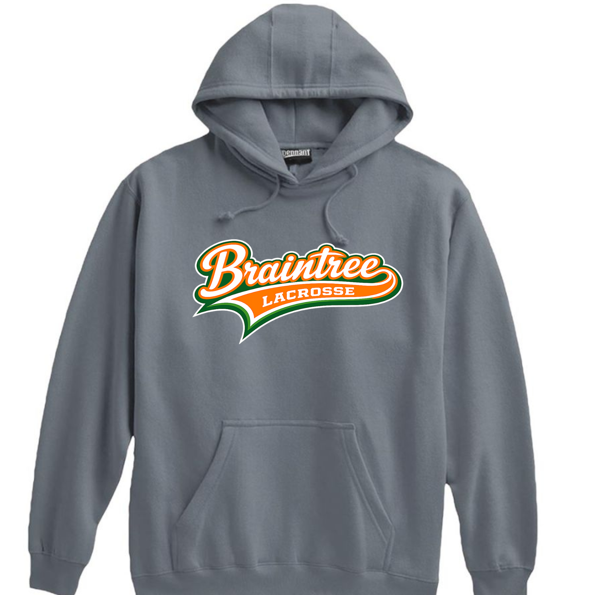 Pennant brand, battleship grey Braintree Lacrosse hooded sweatshirt with orange, green, and white lettering. Back features custom BYL logo in kelly green, orange, white, and black with a shamrock accent. Perfect for St. Patrick's Day! Super-10 Hoodie features 10 oz. superweight fleece in full athletic cut. 3-panel hood, rib knit cuffs and waistband that won’t stretch out of shape. Double needle stitching, side seams, reinforced necktape, and locker loop.