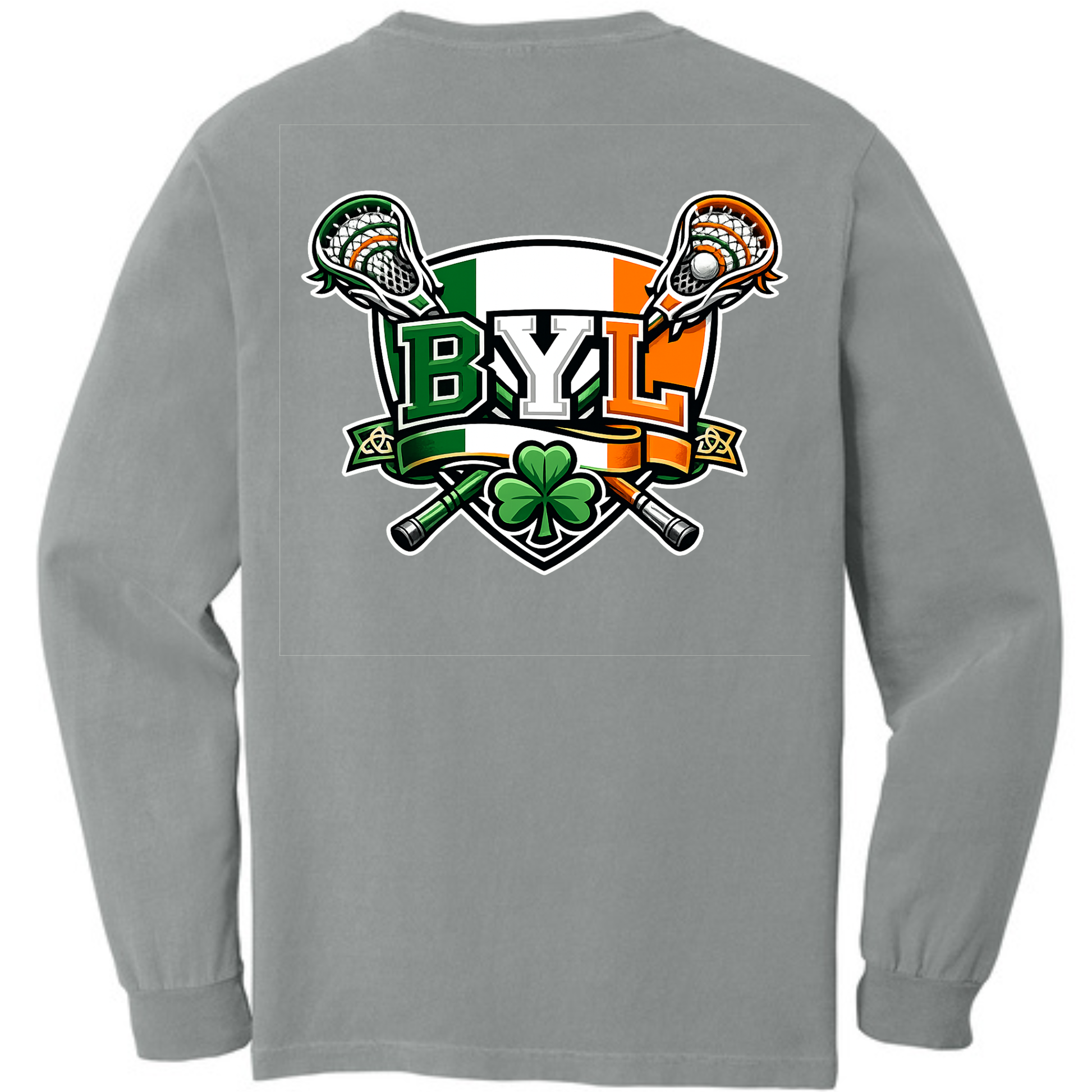 Introducing Comfort Colors brand, granite grey Braintree Lacrosse long sleeve shirt with orange, green, and white lettering. Back features custom BYL logo in kelly green, orange, white, and black with a shamrock accent. Perfect for St. Patrick's Day! Shirt is a relaxed fit, with soft washed, garment-dyed fabric, rib collar and cuffs, and twill-taped neck and shoulders.