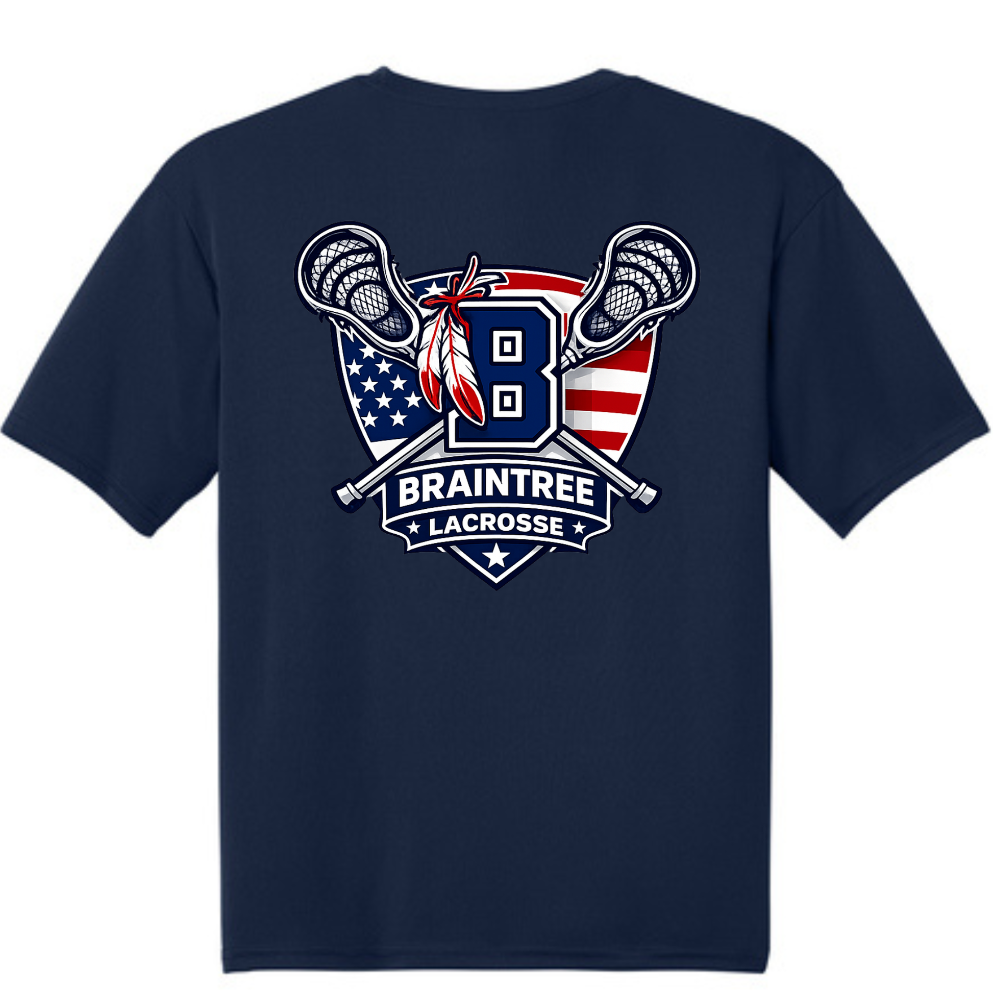 Introducing A4 brand, navy blue Braintree Lacrosse short sleeve performance shirt with stars and stripes, red, white, and blue lettering. Back features custom Braintree Lacrosse stars and stripes logo in red, white, and blue. Shirt is made from superior moisture wicking material for peak performance, with an ultra tight knit, stain release and odor resistance for easy care, and 44+ UPF for UV sun protection.